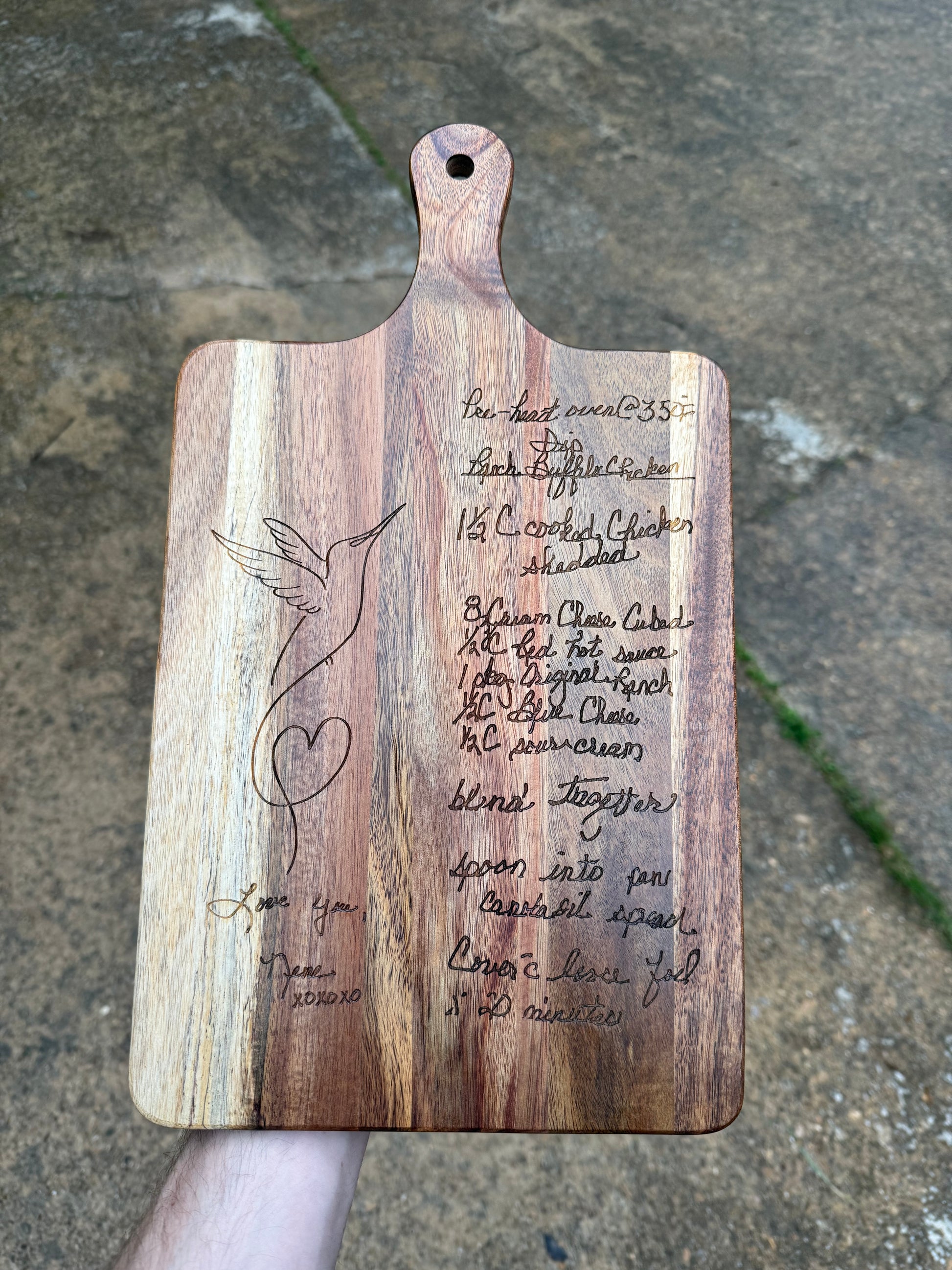 Celebrate family, food, and memories with our Custom Engraved Cutting Boards, featuring your loved one’s actual handwriting. Whether it’s Grandma’s famous casserole, a secret BBQ recipe, or a heartfelt note, we turn it into a one-of-a-kind keepsake that’s perfect for gifting or displaying in your home.